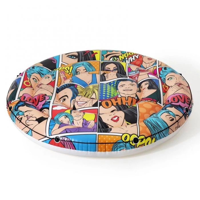 The POP Art Pool Island float has some pretty cool comic book graphics and perfect for pool time. This supersized sitting area has a wraparound grab rope with built-in grommets. Max of two users at a time. Weight capacity 396.8 lb. Puncture resistant vinyl material. Unique and modern design. Interlocking quick release valve.