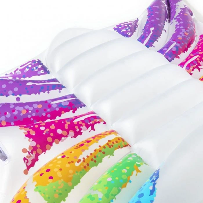 Spread your wings and float this summer with the bestway rainbow butterfly pool float! The colorful graphics bring just the right amount of personality to your pool, lake or beach day. The large sitting area has a built-in pillow which is perfect for a day of relaxing on the water. There are two handles placed on the outer edge! Recommended age: 8 years and up. Material: vinyl. Dimensions: 9 ft 8 in. x 6 ft 4 in.