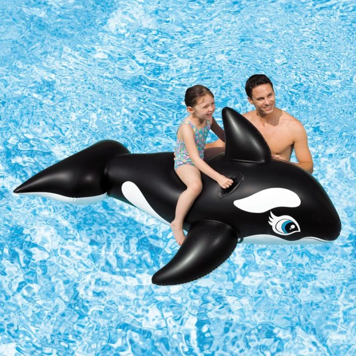 A giant Whale Ride-On pool float for the imaginative animal trainer in all of us. Sized at 76 in. x 47 in., up to two riders can climb on easily. Almost like the real thing, hold on tight to the heavy-duty handles! Constructed of sturdy, 12 gauge vinyl with 2 air chambers and includes a repair patch. An insiders note: because of the floats large size, don’t blow up float to max size – let out some of the air so that riders can stay on easily. Recommended for children ages three and up.